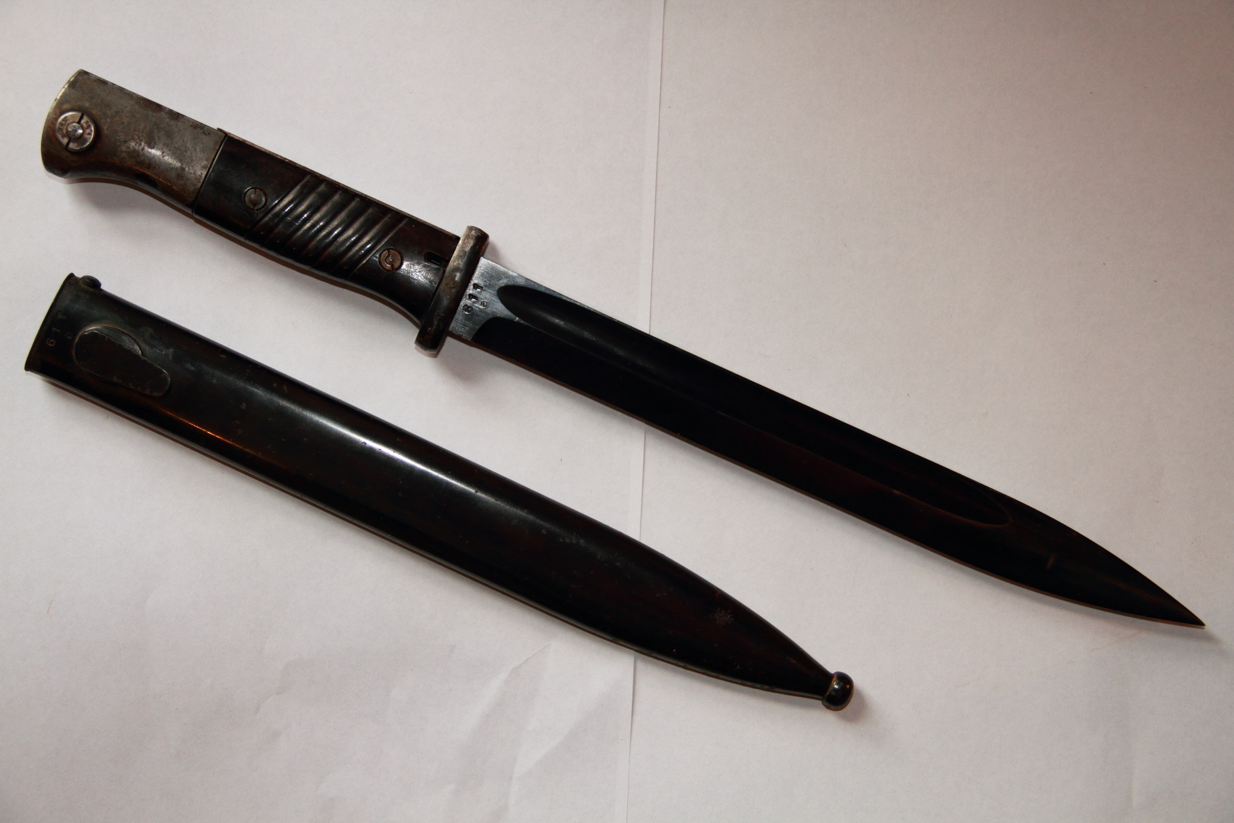 The markings on it tell us that it is a 1941 bayonet for the standard K98 Mauser rifle. In particular the “41 fnj” printed on the blade and on the scabbard indicate that is was made in 1941 by the Alex Copel factory in Solingen, a German town still known today for its good knives!
